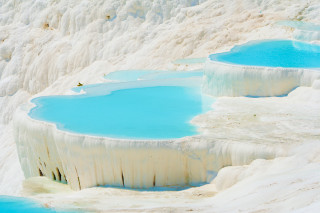 Het stadje Pamukkale (wat "kasteel van katoen" betekent in het Turks) is een waar natuurfenomeen in Turkije. Doordat het water zoveel kalk bevat, worden dikke pakketten kalk gevormd die zich langs de terrassen afzetten. Hierdoor krijg je dit spectaculaire uitzicht. De watertemperatuur bedraagt 35° en hierdoor is het een perfecte "hot tub"!