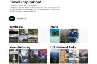 Het maakt niet uit welke bestemming jouw interesse wekt, dit bord laat je per land de mooiste foto’s zien. En dat is nog niet alles, ook zijn er speciale secties over tips & tricks, inpaktips, budget travel en nog veel meer!