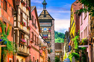 Bonjour! Belle en het Beest speelt zich natuurlijk af in een pittoresk dorpje in Frankrijk. Tegenwoordig zijn er nog steeds dorpjes die rechtstreeks uit de middeleeuwen komen, zoals Ribeauvillé en Riquewihr, midden in natuurpark de Vogezen, vlakbij Straatsburg. Niet raar opkijken als je Gaston (in zekere vorm) tegenkomt!