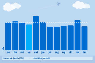 Zoals je ziet liggen de prijzen voor Jakarta een groot deel van het jaar redelijk gelijk. De maand mei is wel duidelijk een uitschieter en dus niet de beste optie om je ticket te boeken. Met een temperatuur die het hele jaar door boven de 30 graden ligt, maakt het eigenlijk niet zo veel uit in welke tijd van het jaar je naar Jakarta vertrekt.