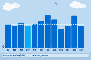 April is een goede maand om je te ticket te boeken naar the city that never sleeps. Vanaf dan stijgen de prijzen weer enorm tot na de zomer. September is ook een voordelige maand om je ticket te boeken, terwijl de zomermaanden, en vooral juli, de duurste zijn. Ga jij naar flitsende reclameborden op Times Square, de iconische Brooklyn Bridge, het Vrijheidsbeeld, en dan even relaxen in Central Park? New York is zo veelzijdig!