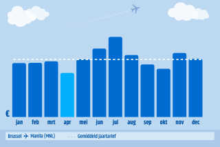 In 2018 was april de goedkoopste maand van het jaar om een ticket te boeken naar Manila. De zomermaanden zijn alweer de duurste maanden om te boeken, vooral juli loopt hoog op. Een tweede goede optie om je ticket naar Manila te boeken is oktober, dan zijn de prijzen ook relatief laag.