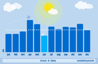 De gestippelde witte lijn is het gemiddelde tarief voor de route over het hele jaar. De blauwe balkjes staan voor de gemiddelde ticketprijs in die maand.