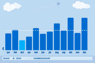 De gestippelde witte lijn is het gemiddelde tarief voor de route over het hele jaar. De blauwe balkjes staan voor de gemiddelde ticketprijs in die maand.