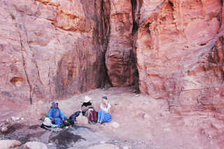 Ik kies voor een alternatieve route die over een berg naar de ‘Place of Sacrifice’ leidt en vervolgens een onbekend pad laat slingeren dwars door de magische oude stad. Bijna verdwaald tol ik langs de oneindige rotsformaties en bouwwerken en vanuit het niets zitten daar plots twee bergbewoners, een oude vrouw en haar dochter. Een pot thee staat op het vuur, ze wenken me. Mijn handen worden vastgehouden, ik krijg een kop thee en stukjes droog brood toegestopt. We hebben een bijna woordenloos gesprek over de dood van haar man. Met een kus (een zegen) op mijn voorhoofd als afscheid is dit één van de meest bijzondere momenten in Jordanië. Wolkig dwaal ik verder en vind ik via de bijzondere Monestary langzaam mijn weg terug.