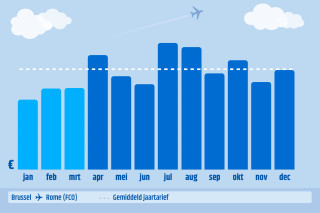 Nu weet je wanneer je de goedkoopste vliegtickets kunt boeken, maar wanneer reis je het goedkoopst? Want die gemiddelde ticketprijs in bijvoorbeeld januari, kan alsnog duurder worden als je in een dure periode vertrekt. Daarom zochten we ook voor je uit wat prijstechnisch de meest gunstige maand is om naar Rome te vliegen.