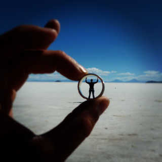 De zoutvlakte Salar de Uyuni in Bolivia leent zich ook bijzonder goed voor perspectieffoto's. Deze is wel erg cool!