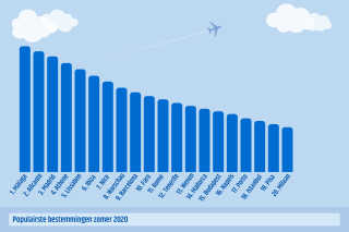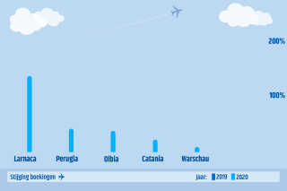 Iedere zomer zijn er bestemmingen die opeens veel meer aandacht krijgen dan het voorgaande jaar. Dat was deze zomer niet anders. Voor het Cypriotische Larnaca was het verschil het grootst ten opzichte van dezelfde periode vorig jaar. De boekingen voor deze stad stegen met 140%. In 2019 was er voor deze bestemming helemaal geen stijging te zien. Ook het Italiaanse Perugia was deze zomer met een stijging van 44% veel populairder in vergelijking met vorig jaar. Daarnaast was er dit jaar ook voor Olbia, Catania en Warschau een stijging in het aantal boekingen te zien.