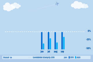 Dit jaar was de gemiddelde ticketprijs in alle zomermaanden goedkoper ten opzichte van 2019. In juni was de gemiddelde ticketprijs bijna 35% goedkoper ten opzichte van dezelfde periode vorig jaar. Voor de maand augustus was de gemiddelde ticketprijs 31% goedkoper in vergelijking met vorig jaar. In juli was de gemiddelde ticketprijs 19% goedkoper in vergelijking met vorig jaar. Voor de maand september was het verschil met 2019 het kleinst. De gemiddelde ticketprijs in september was 14% goedkoper ten opzichte van vorig jaar.
