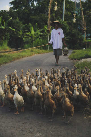 Dit was stiekem mijn persoonlijke hoogtepunt. Zelfs Gede (onze Balinese host) was ontzettend verbaasd dit tafereel tegen te komen. Je ziet dit namelijk echt niet vaak op deze manier. We reden nietsvermoedend in the middle of nowhere op een klein weggetje in het oosten van Bali toen plots deze herder met zijn eenden verscheen. Ik sprong als een idioot uit de auto om foto’s te maken, wat een geweldig gezicht. De eenden lopen rond op de rijstvelden om zo de overgebleven korrels en insecten op te eten. Ik ben verliefd op eenden, kijk nou toch eens!