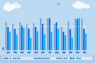 JFK Airport ligt alle maanden boven de gemiddelde ticketprijs naar New York in 2018, en is dus ook de duurste luchthaven van de drie. LaGuardia Airport is voor alle boekmaanden (behalve november) de goedkoopste optie, maar zoals al genoemd, vliegen er geen airlines rechtstreeks naar deze luchthaven. Je zult dan dus wel een overstap moeten maken.